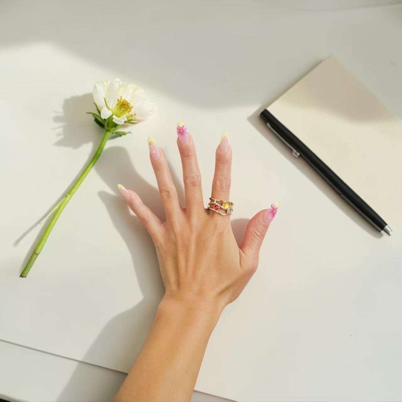 Featuring an organic, open-frame design, this ring is accented with smooth, rounded coloured stones that bring a subtle pop of colour and individuality. The fluid metal structure creates a modern, sculptural look, while the varied stone tones add depth and visual interest without overwhelming the design.