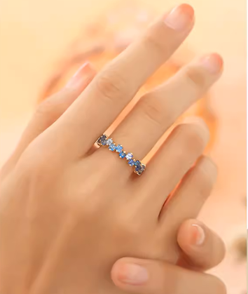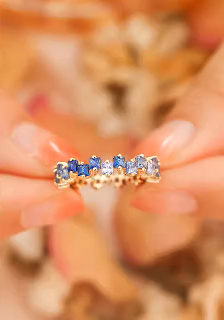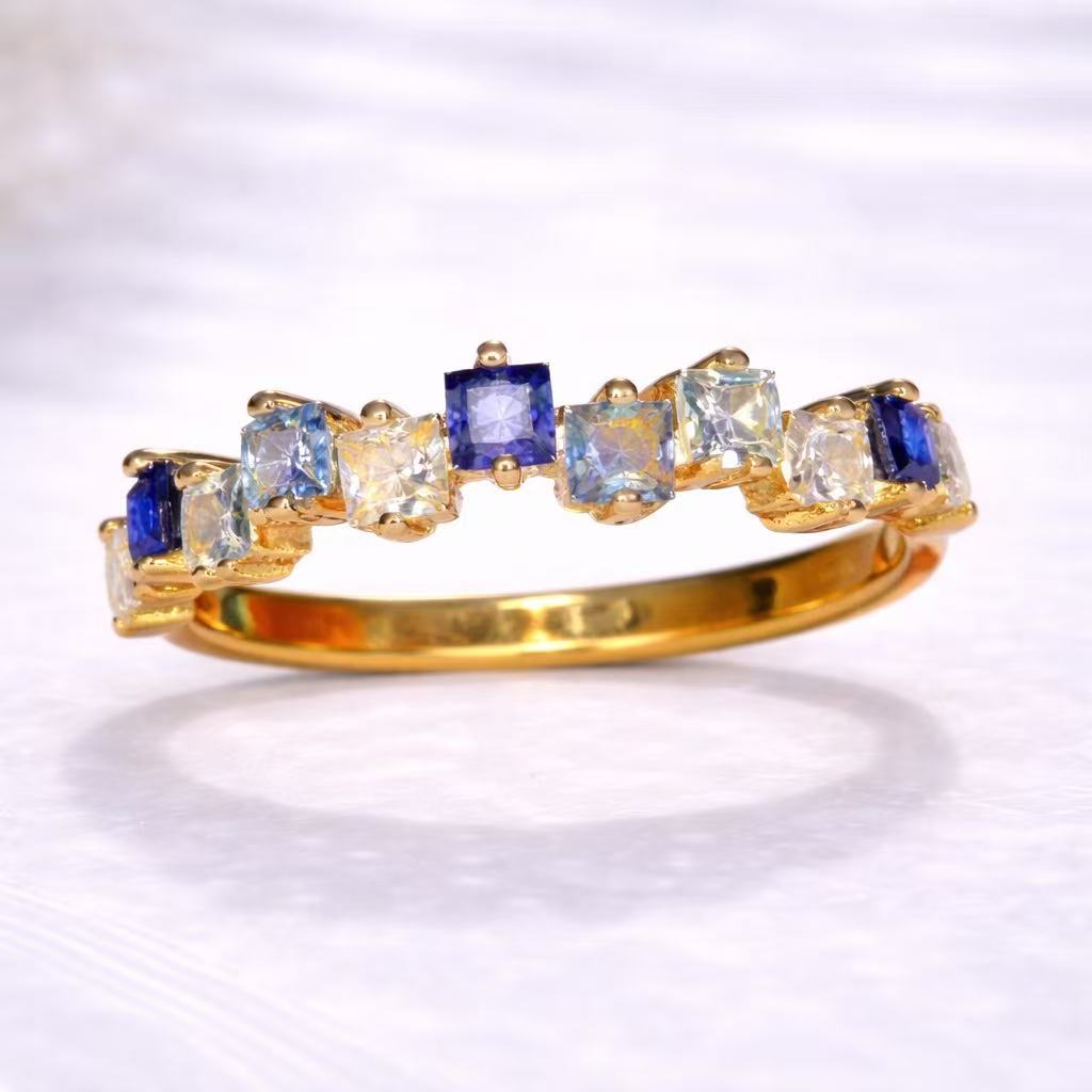 Featuring a row of square-cut crystals in varying shades of blue, soft yellow, and iridescent hues, this ring creates a subtle gradient effect with a candy-like glow. The slightly raised arrangement of stones adds dimension and visual interest, giving the piece a unique and lively character.