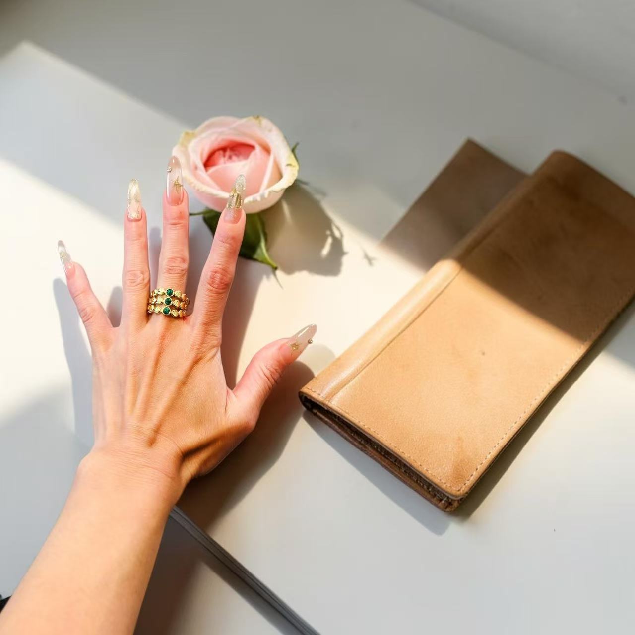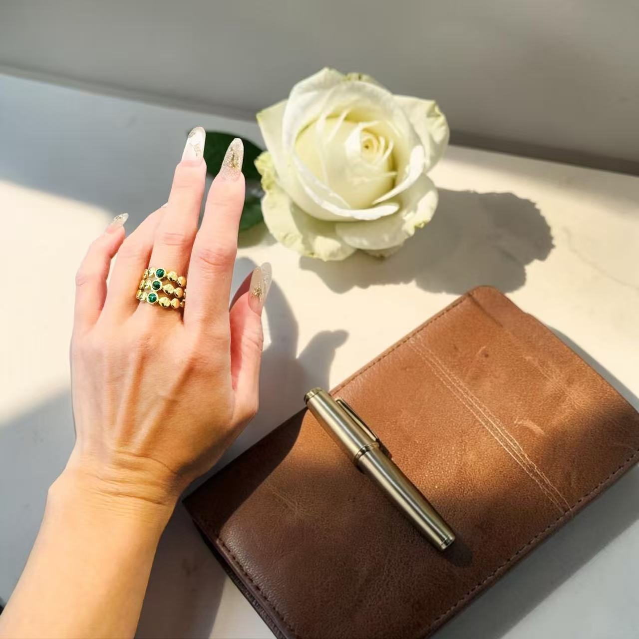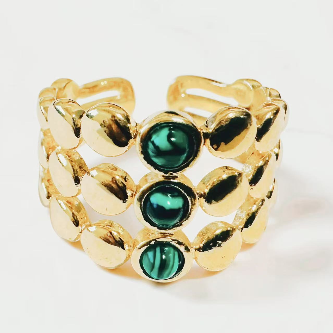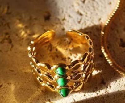 Featuring a multi-layered open design, this ring is detailed with polished bead-like elements and rich emerald-toned accents that create a striking visual contrast. The structured yet open silhouette adds dimension, while the deep green tones bring a refined, slightly vintage-inspired feel.