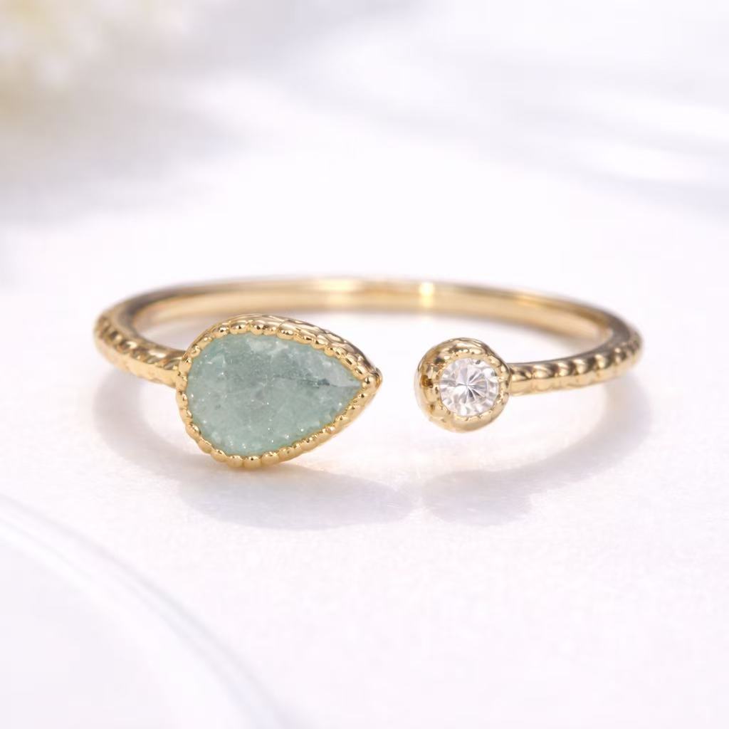Featuring a pear-shaped green crystal set in a warm gold-tone finish, this ring offers a clean and sophisticated silhouette with a subtle light-luxury feel. The open adjustable design ensures a comfortable fit while keeping the style effortlessly versatile — perfect for adding a pop of colour to both casual and dressy outfits.