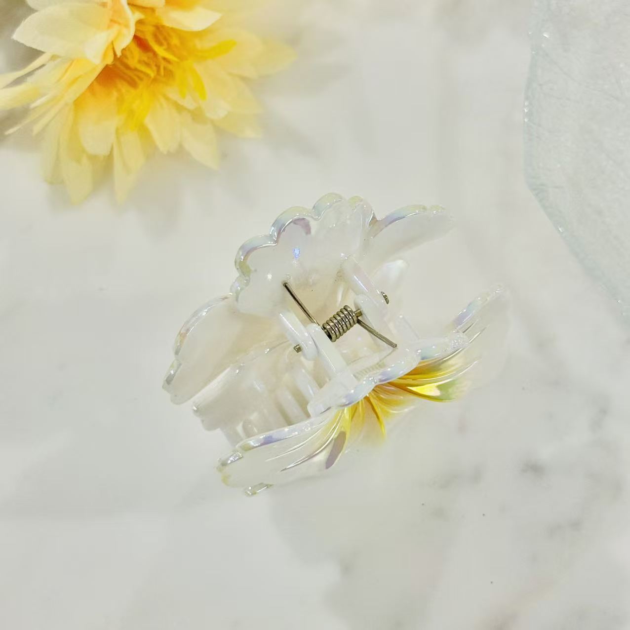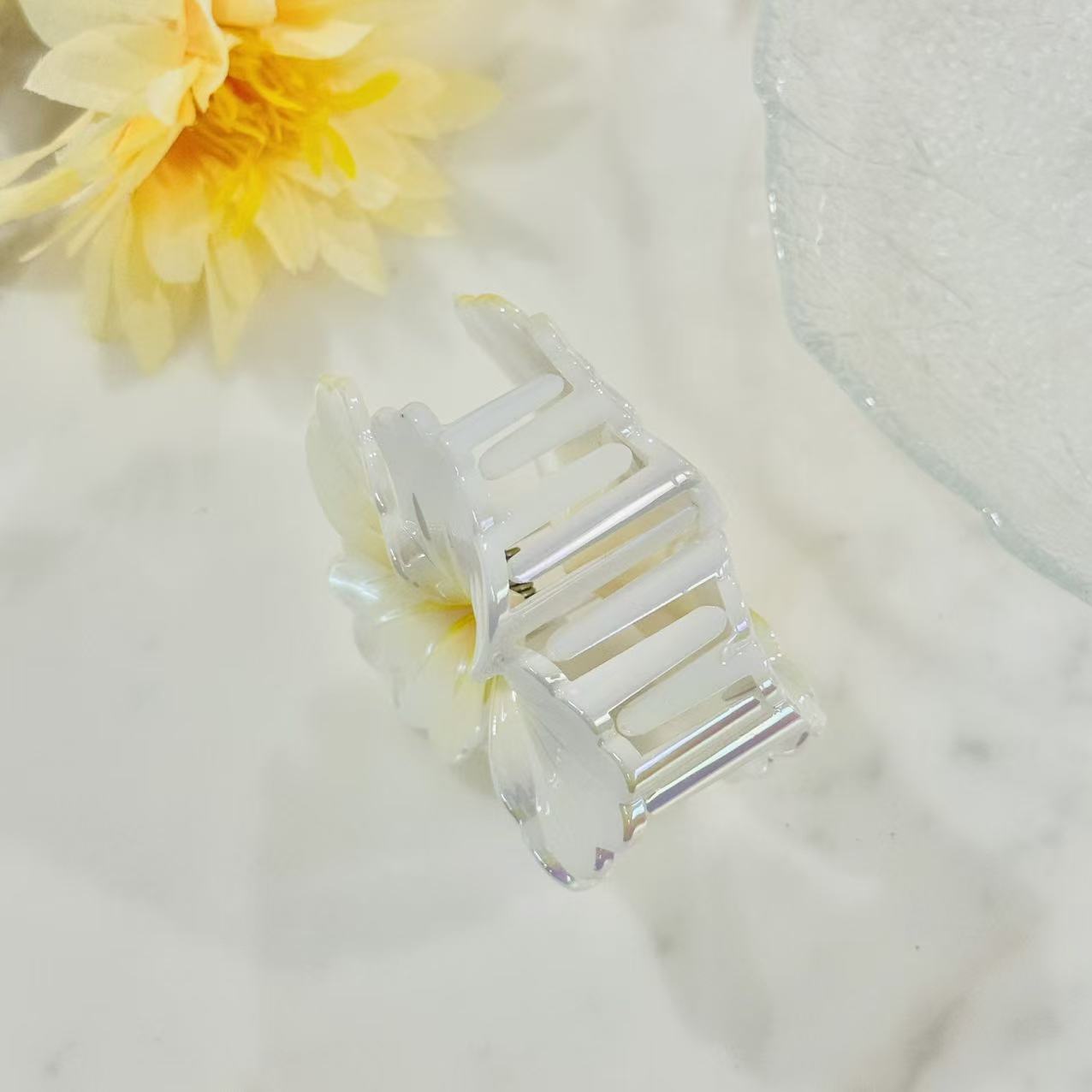Add a soft, luminous touch to your everyday look with this iridescent hibiscus claw clip.
