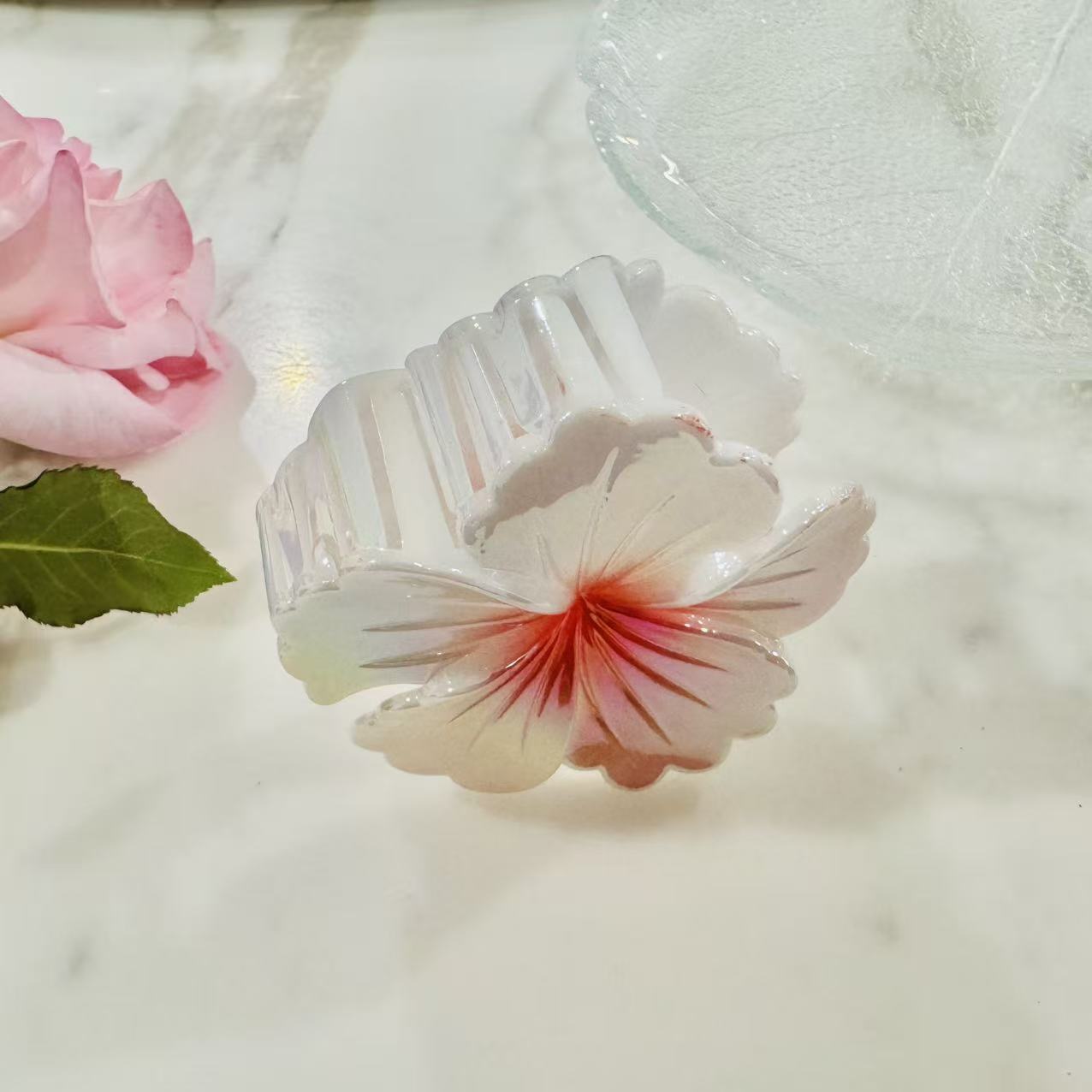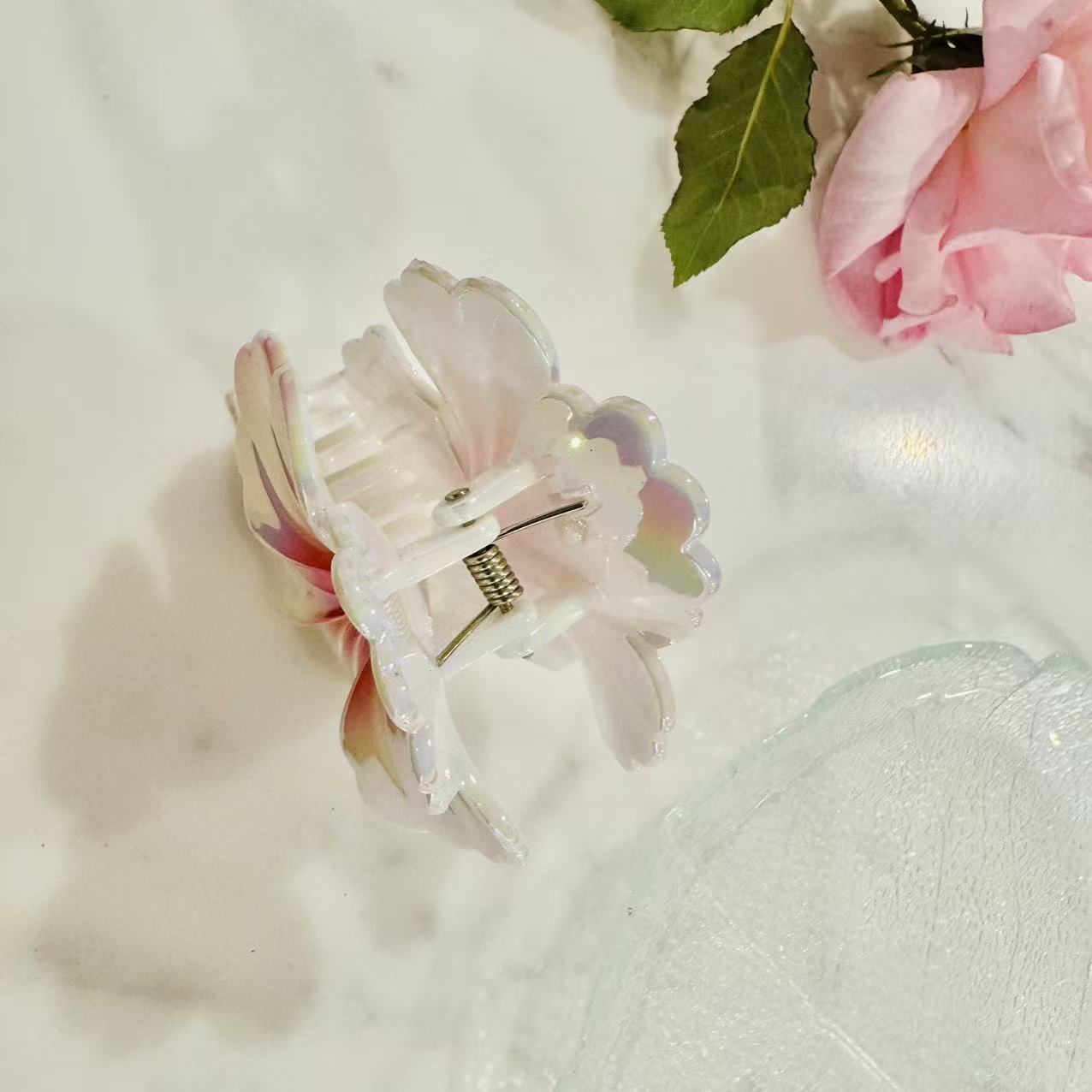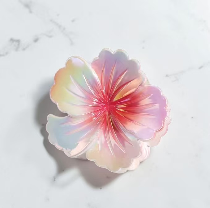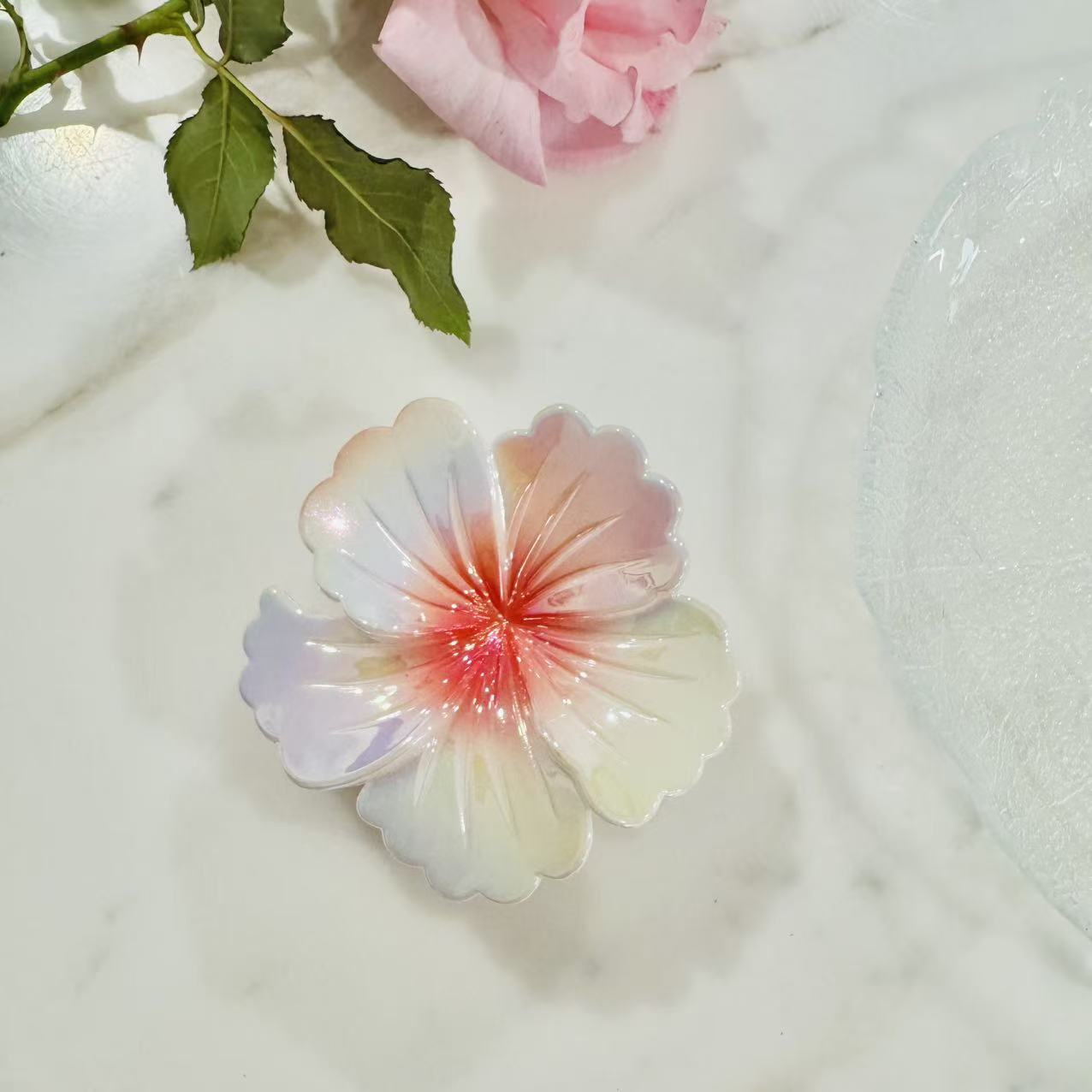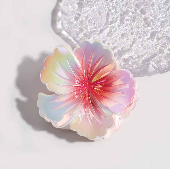 Add a soft, luminous touch to your everyday look with this iridescent hibiscus claw clip.