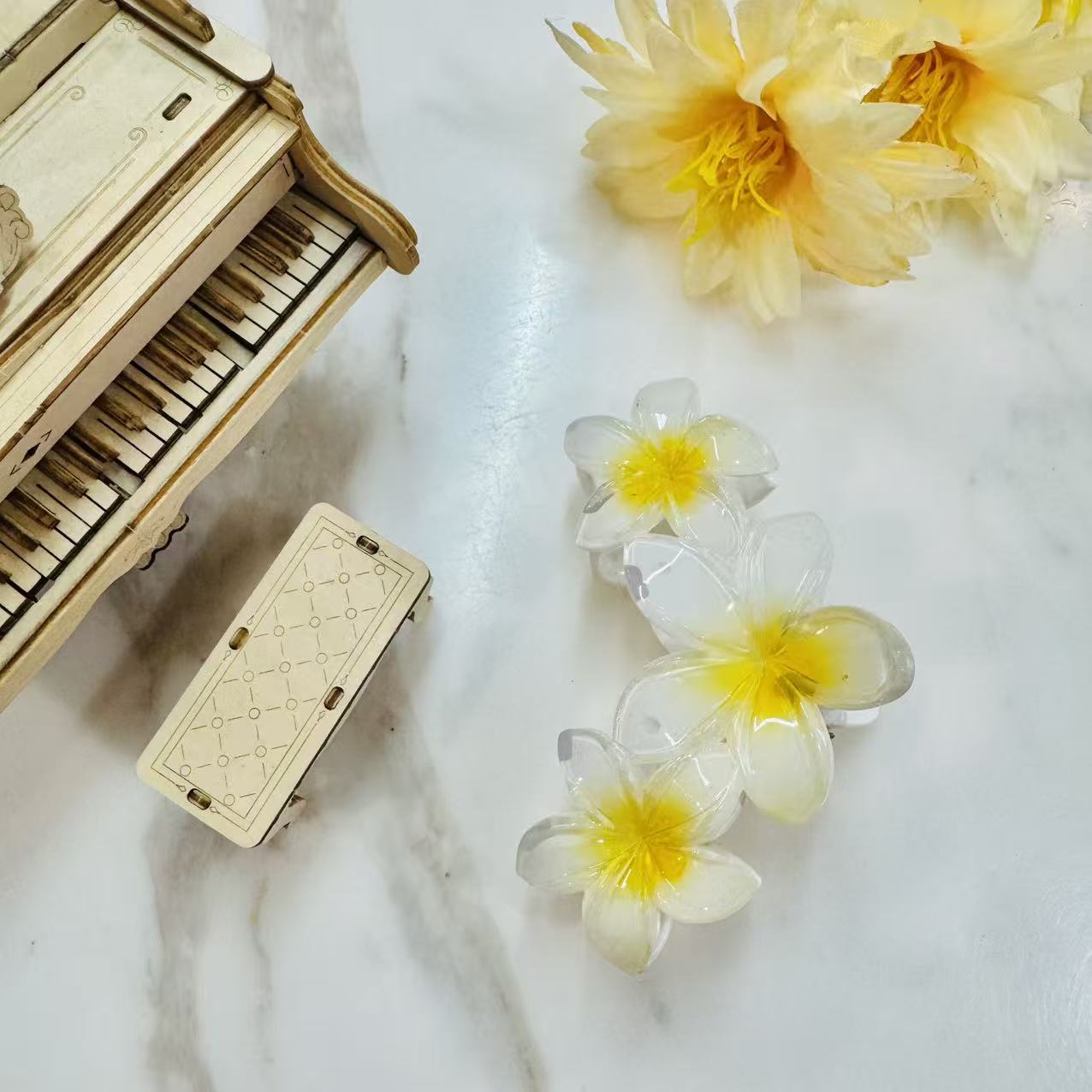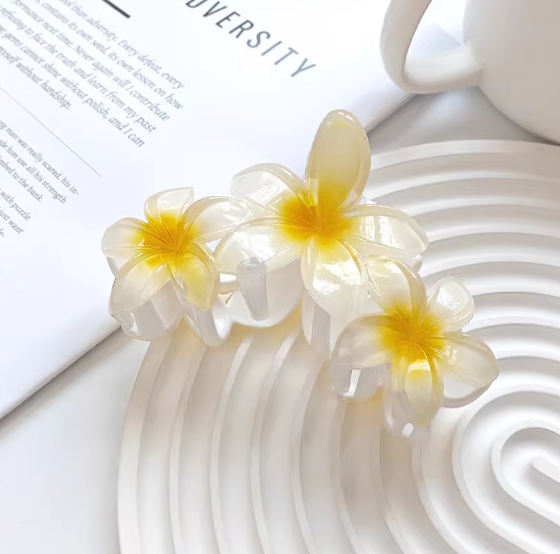 Featuring a beautifully arranged trio of frangipani flowers, this piece is designed with a smooth pearl-like finish and warm yellow centres that bring a subtle, sunlit glow to your hairstyle.