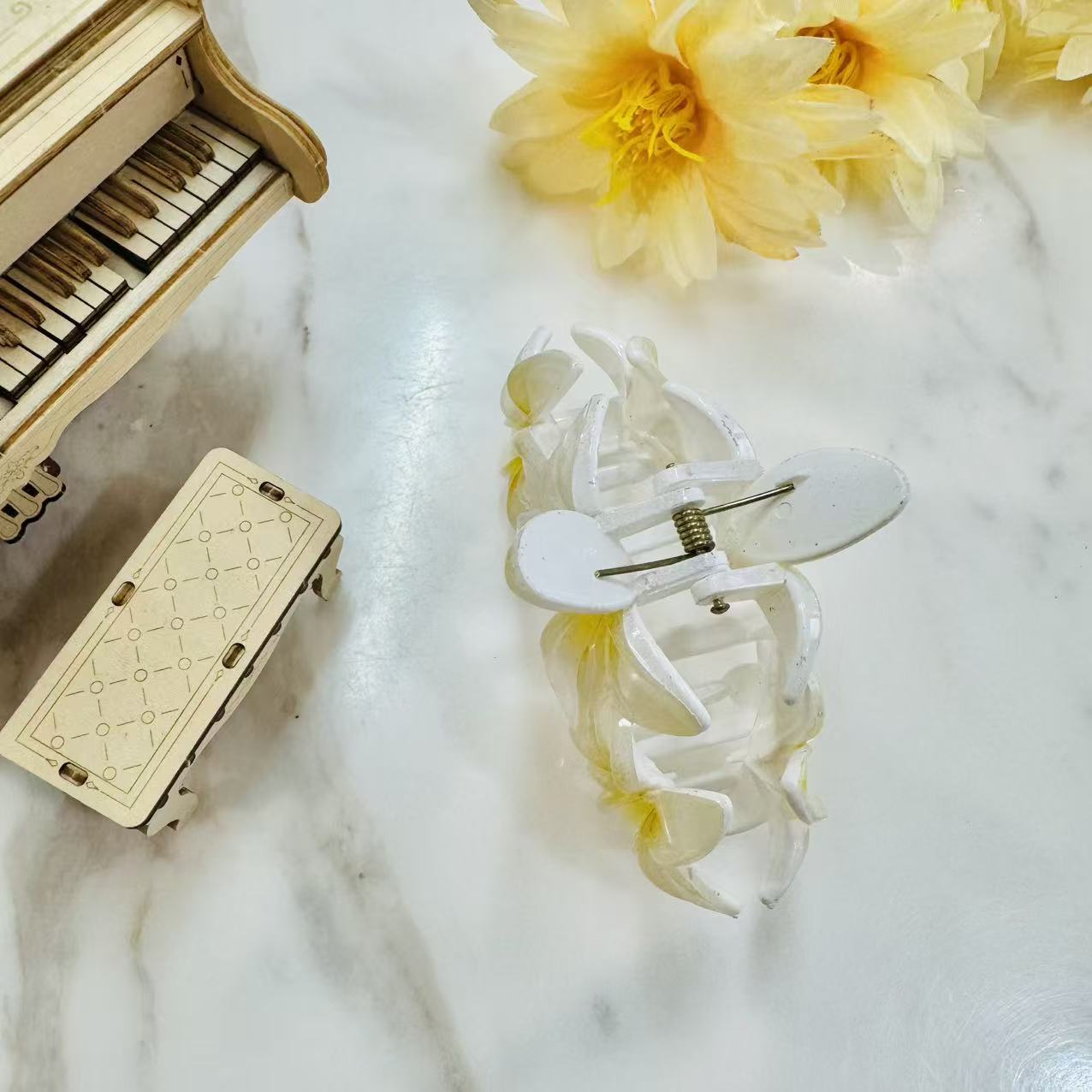 Add a statement touch of soft elegance to your everyday look with this pearl frangipani claw clip.