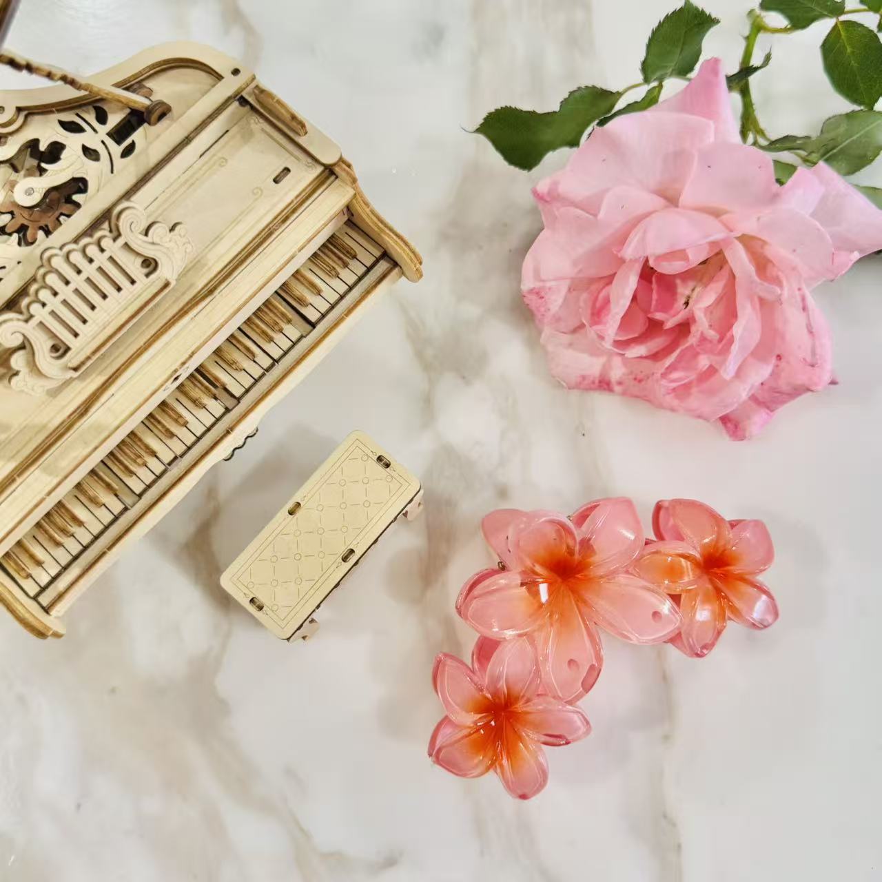 Featuring a beautifully arranged trio of frangipani flowers, this piece is designed with a smooth pearl-like finish and warm sunset tones that blend soft red and orange hues, creating a radiant glow in your hairstyle.