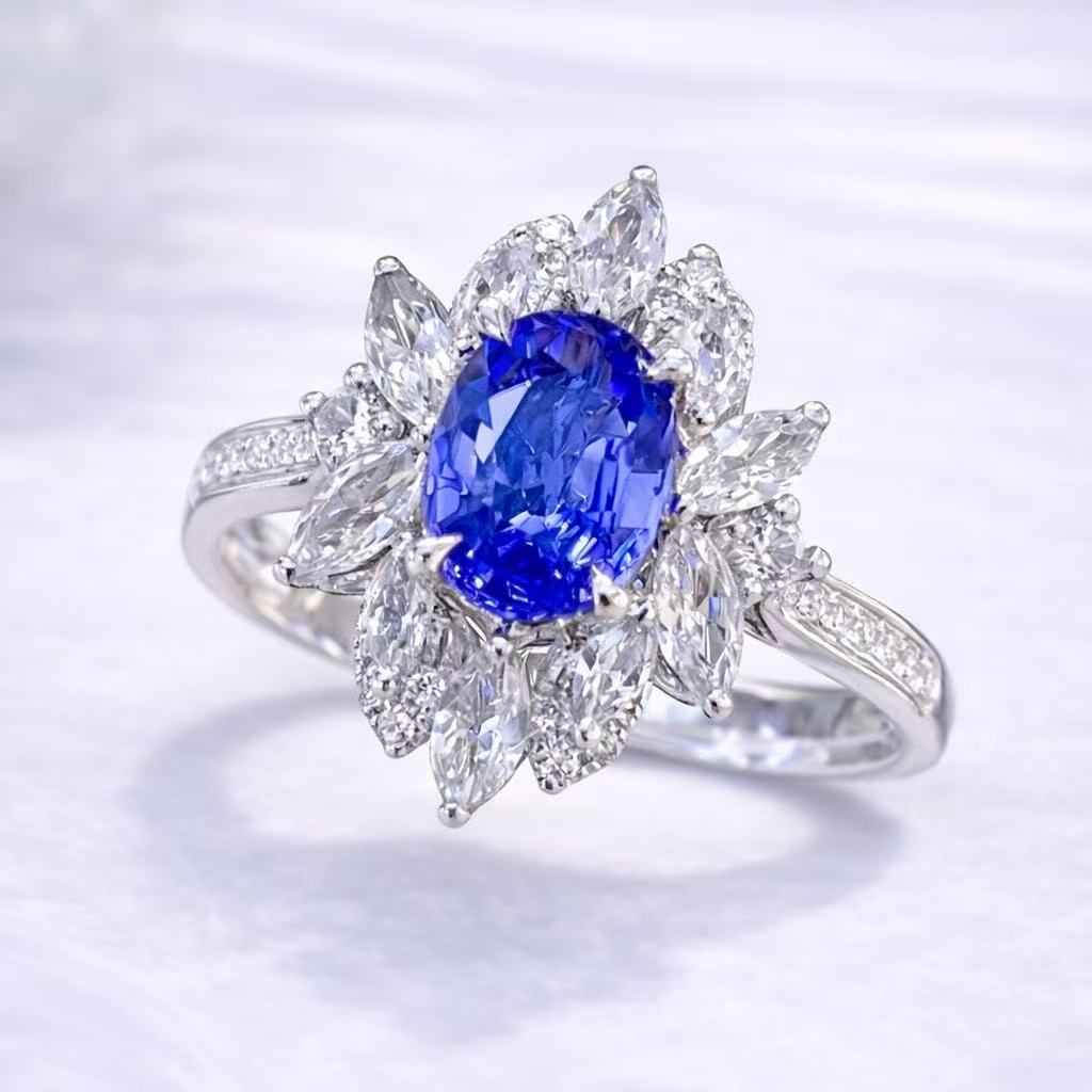 • Crystals: Sapphire-blue oval crystal with clear halo accents