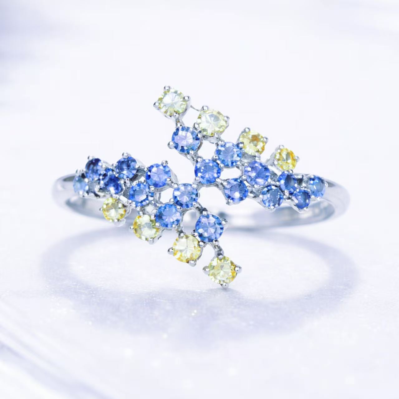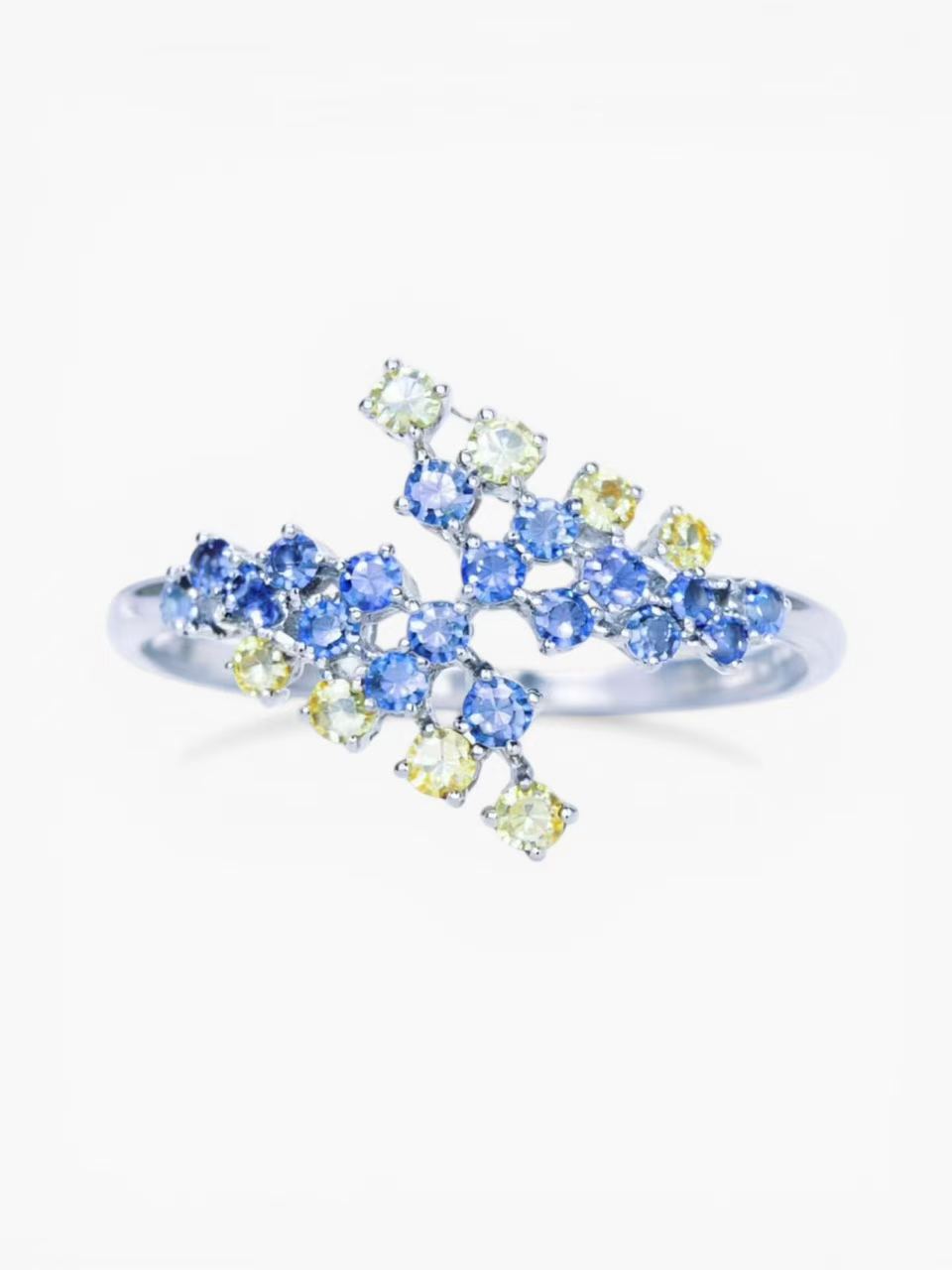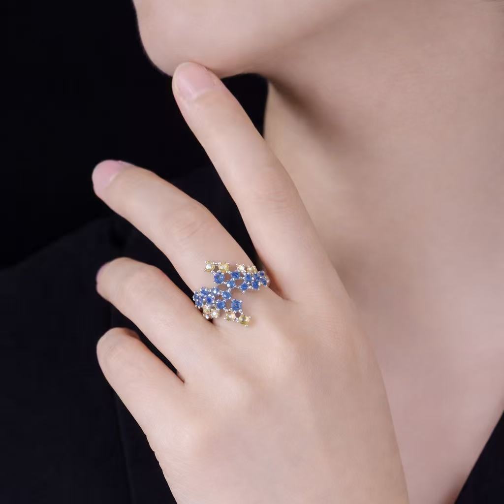 Featuring a cluster of finely set crystals in varying shades of blue and soft golden yellow, this ring creates a subtle gradient effect that captures the feeling of twinkling stars against a night sky. The asymmetrical, branch-like arrangement adds a sense of movement and lightness, making the design feel both graceful and unique.
