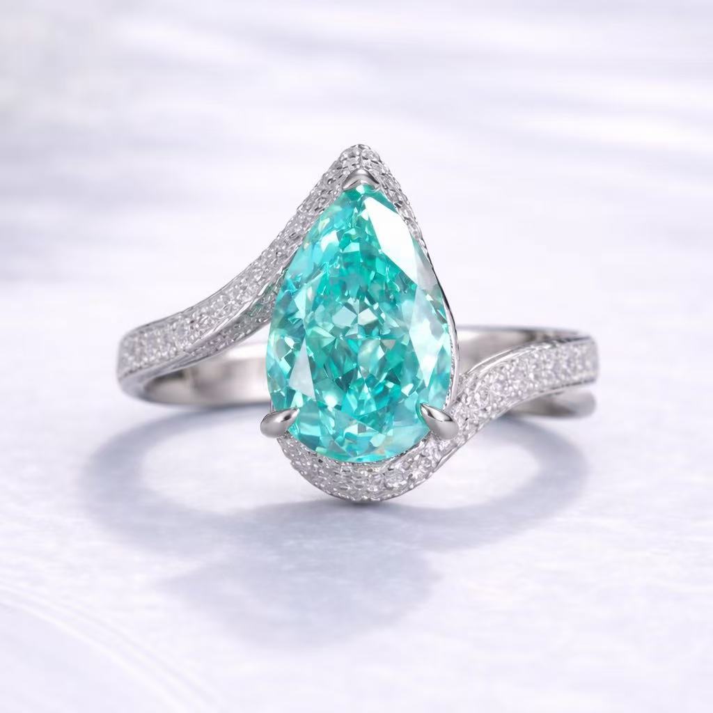 Featuring a striking aqua-blue teardrop crystal centrepiece, this ring is framed by delicate pavé crystal accents that gracefully follow the flowing curve of the band. The sweeping design creates a soft, fluid silhouette that enhances the brilliance of the centre stone while maintaining a refined and balanced look.